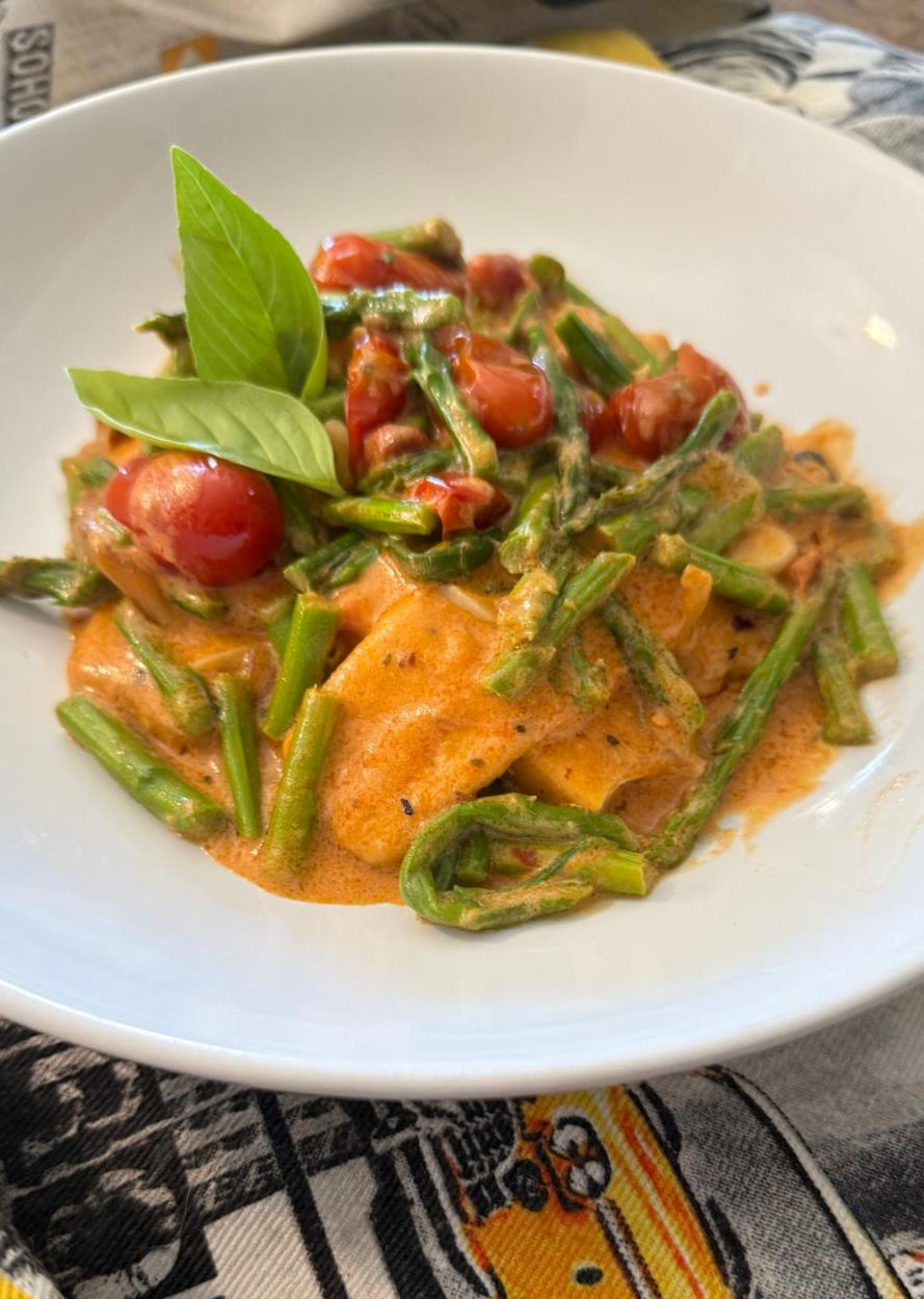 אז טבענתי לנו מנה כזו עם עגבניות שרי מבושלות בשמן זית,אספרגוס ושמנת. וזה מה שנקרא אוכל מנחם (כשזה בא עם פסטה)
